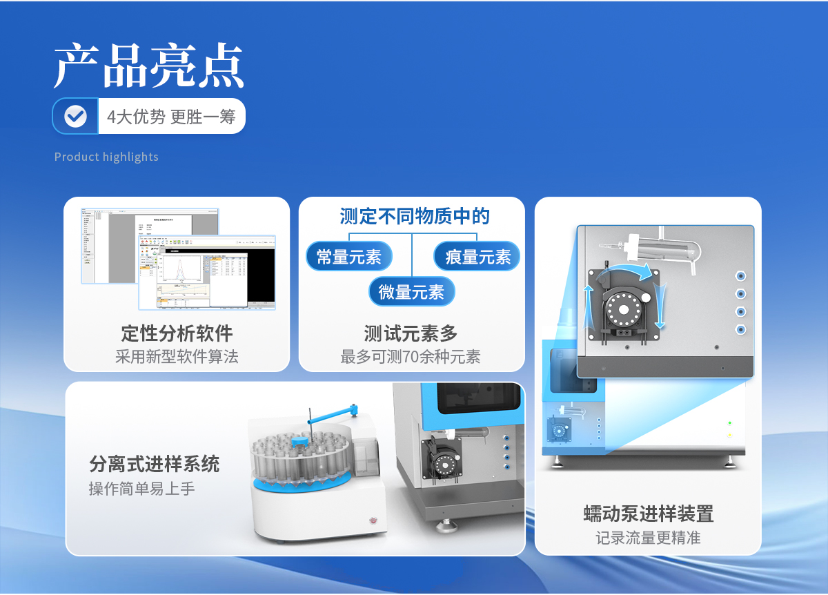 1、測(cè)試元素多,*多可測(cè) 70 余種元素。 2、多元素同時(shí)測(cè)試,一次進(jìn)樣所有元素同時(shí)測(cè)試。 3、分析速度快,每分鐘約 5 個(gè)元素,*快測(cè)試速度可到每分鐘 10 個(gè)元素。 4、檢出限低,絕大多數(shù)元素可達(dá) ppb 級(jí)。 5、線性范圍寬,可達(dá) 5-6 個(gè)數(shù)量級(jí),可以實(shí)現(xiàn)高低含量同時(shí)測(cè)試,無(wú)需更換標(biāo) 準(zhǔn)曲線。 6、化學(xué)干擾少,測(cè)試結(jié)果更加精準(zhǔn)。