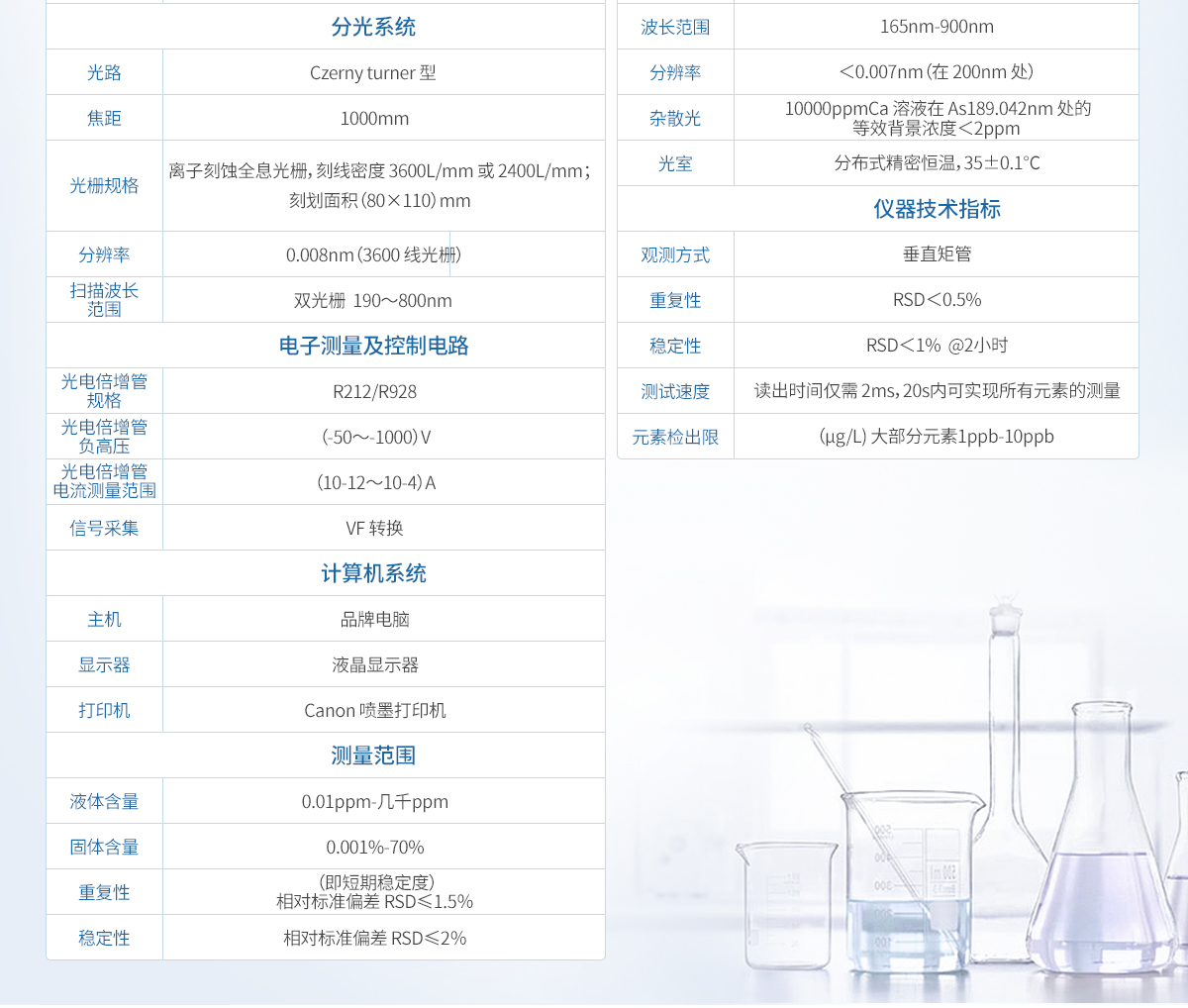 6、性能指標 6.1 分析速度:≥每分鐘 50 個元素或譜線,而且每條測量譜線的積分時間≥10 秒; 6.2 樣品消耗量:<2ml,測定不少于 70 個元素; 6.3 譜線靈活性:可實現分析元素的定性、半定量和定量分析; 6.4 線性動態(tài)范圍:≥106; 6.5 內標校正:內標校正功能,可實現內標元素和測量元素的同時曝光; 6.6 精密度:測定 1ppm 或 10ppm 多元素混合標準溶液,重復測定十次的 RSD≤0.5%; 6.7 穩(wěn)定性:測定 1ppm 或 10ppm 多元素混合標準溶液,長時間穩(wěn)定性 RSD<1.0%; 6.8 檢出限:典型元素檢出限z低可達 0.1ug/L。