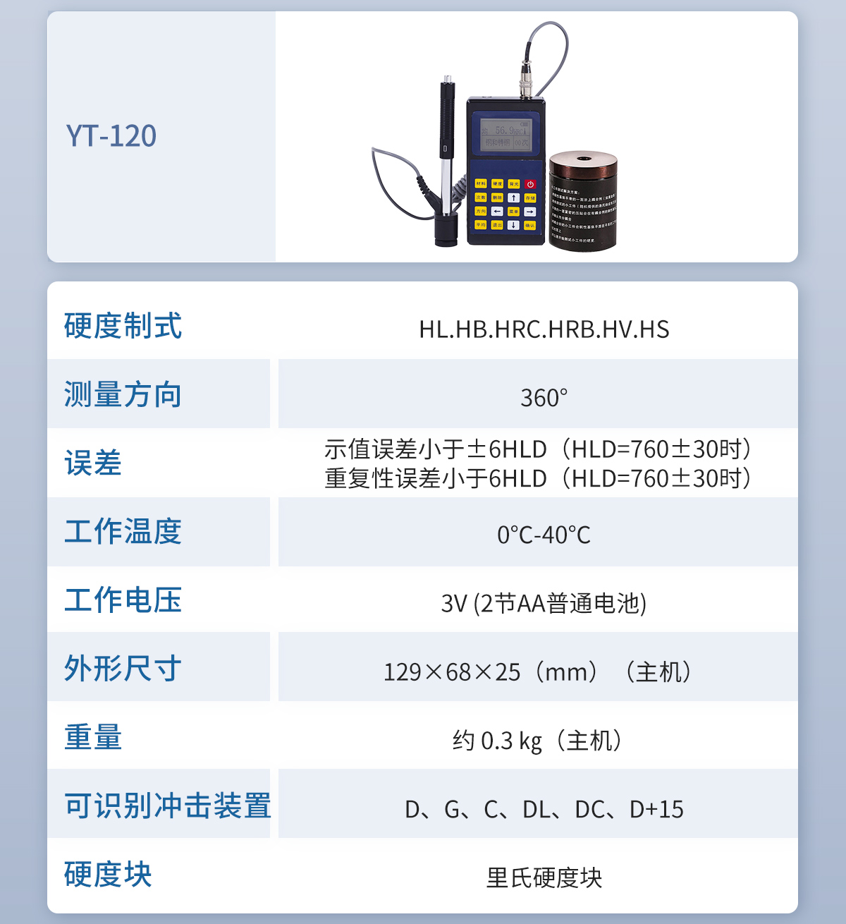 產(chǎn)品介紹: 布洛維里氏硬度計(jì) YT-110 概述YT-110里氏硬度計(jì)是我公司生產(chǎn)的多功能的硬度測量儀器。使用全中文顯示,菜單式操作,操作簡單、方便。本機(jī)可直接;顯示里氏、布氏、洛氏、維氏、肖氏等各種硬度值···2025-04-04