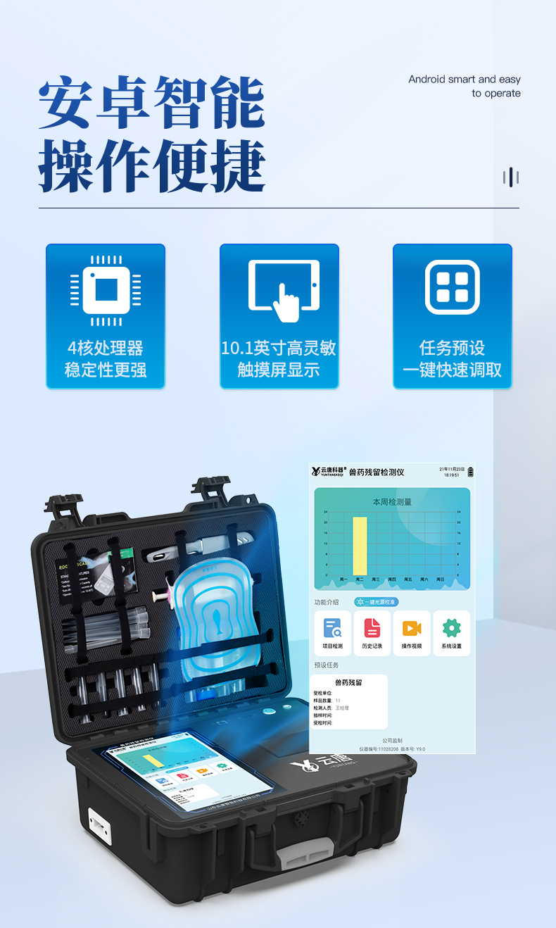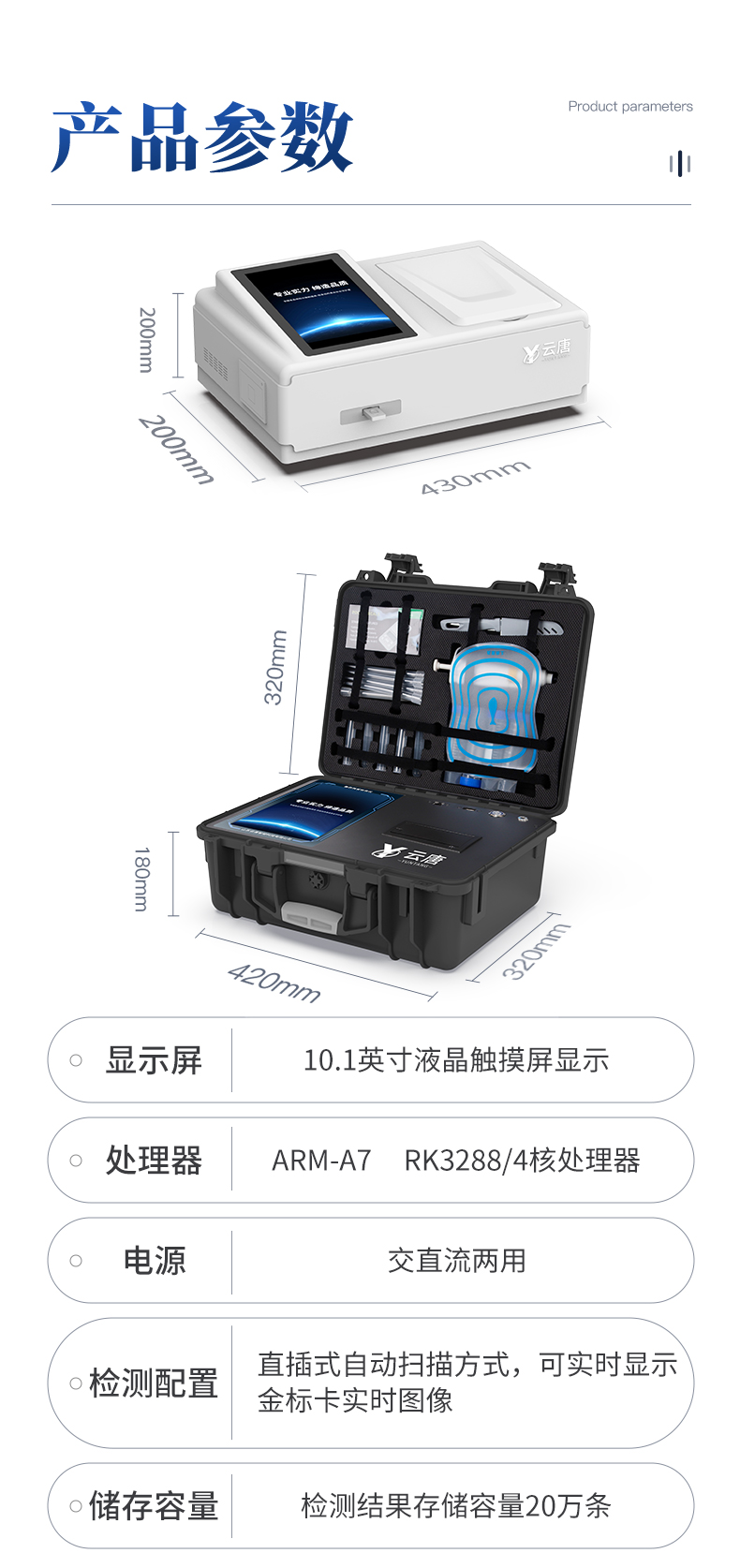 | 儀器采用臺式一體化系統(tǒng)檢測技術(shù),將分光光度模塊、數(shù)字化管理模塊、無線通訊模塊高度集成于一體,可支持檢測60種食品安全檢測項(xiàng)目,同時預(yù)留升級檢測方法。 | 儀器檢測模塊標(biāo)準(zhǔn)化、智能化,檢測項(xiàng)目可隨意自由組合。檢測箱體內(nèi)置多個標(biāo)準(zhǔn)檢測單元,檢測模塊可以調(diào)整配置。 | 顯示屏幕:儀器采用10.1英寸豎向液晶觸摸屏顯,搭配運(yùn)行安卓智能操作系統(tǒng),主控芯片采用ARM Cortex-A7,RK3288/4核處理器,主頻1.88Ghz,操作方便,性能更強(qiáng)。 | 檢測通道:≥12通道;采用精密旋轉(zhuǎn)比色池設(shè)計,使用同芯片同光源校準(zhǔn)精度,解決不同光源之間的誤差值,更加準(zhǔn)確**。(1-12通道間誤差0.1%,***:**202022821055.2) | 儀器光源:高精度進(jìn)口四波長冷光源,每個通道均配置 410、520、590、630nm 波長光源,標(biāo)配**的光路切換裝置,專利光路切換功能可實(shí)現(xiàn)64波長,并且所有檢測項(xiàng)目可實(shí)現(xiàn)所有通道同時檢測。 | 設(shè)備可一鍵校準(zhǔn),自動保存校準(zhǔn)數(shù)據(jù),自動對比校驗(yàn),得到精準(zhǔn)光源,采用Android SP存儲數(shù)據(jù),光源數(shù)據(jù)永不丟失,方便每一次使用。 | 通訊接口:配備無線通信模塊、4G(APN)通訊模塊、藍(lán)牙傳輸,同時具有雙USB接口以及RJ45網(wǎng)線接口,可以多方式實(shí)現(xiàn)數(shù)據(jù)保存及數(shù)據(jù)傳輸。 | 存儲方式:支持U盤存儲,標(biāo)準(zhǔn)USB接口,免驅(qū)動安裝。檢測結(jié)果存儲容量20萬條以上,可生成Excel表格進(jìn)行拷貝,并具有登錄保護(hù)功能。 | 智能化操作系統(tǒng): | 1、操作系統(tǒng):儀器可在同一檢測界面自動對應(yīng)相關(guān)檢測通道,一次性選擇1-12個樣品名稱,無需退出界面,節(jié)省操作時間。并可以對每個通道屬性和樣品信息單獨(dú)進(jìn)行編輯,例如送檢單位、人員,檢測人員等,打印時勾選打印顯示。 | 2、數(shù)據(jù)集成系統(tǒng):設(shè)備首頁自動匯總分析檢測數(shù)據(jù),包含:周檢測數(shù)據(jù)、月檢測數(shù)據(jù),全部檢測總數(shù)量,均包含檢測總數(shù),合格數(shù),不合格數(shù),以及相關(guān)柱形分析圖,各項(xiàng)檢測數(shù)據(jù)一目了然,無需電腦查詢,更加快捷直觀。 | 3、數(shù)據(jù)庫系統(tǒng):十幾項(xiàng)數(shù)據(jù)庫分類管理儀器:包含項(xiàng)目類型、項(xiàng)目數(shù)據(jù)、檢測數(shù)據(jù)、歷史記錄、國標(biāo)信息、曲線信息、采樣信息、檢測信息、受檢信息、復(fù)核信息、圖表信息、光源校準(zhǔn)信息、打印樣式信息、樣品庫信息等等,數(shù)據(jù)庫之間互相協(xié)調(diào)聯(lián)動保證數(shù)據(jù)的真實(shí)完整性。同時產(chǎn)品數(shù)據(jù)庫以及歷史檢測記錄支持一鍵檢索功能。 | 4、限量規(guī)判系統(tǒng):具有限量查詢、添加物質(zhì)合規(guī)判定系統(tǒng)。檢測出結(jié)果后,系統(tǒng)自動調(diào)用系統(tǒng)數(shù)據(jù)庫中相關(guān)國標(biāo)進(jìn)行比對判定,客觀顯示判定結(jié)果是否合格。 | 5、項(xiàng)目預(yù)設(shè)系統(tǒng):儀器具有任務(wù)預(yù)設(shè)模塊,一鍵提前預(yù)設(shè),給出方便快捷的新檢測方案,每一個任務(wù)分別可以設(shè)置不同的樣品、批次、編號、來源、備注、抽樣信息、檢測信息、受檢信息、復(fù)核信息等更多信息。樣品送檢時一鍵調(diào)取保存信息,并可多次調(diào)取,大大提高檢測效率。 | 6、數(shù)據(jù)監(jiān)管系統(tǒng):同步對接監(jiān)管平臺,數(shù)據(jù)可局域網(wǎng)和互聯(lián)網(wǎng)數(shù)據(jù)上傳,檢測結(jié)果可選擇直接傳至食品安全監(jiān)管平臺。進(jìn)行區(qū)域食品安全監(jiān)管及大數(shù)據(jù)分析處理與數(shù)據(jù)統(tǒng)計,檢測區(qū)域食品安全長短期動態(tài),達(dá)到食品安全問題預(yù)估、預(yù)警。 | 7.1、全新打印系統(tǒng):內(nèi)置全新打印機(jī),新創(chuàng)自定義打印方式,可按需靈活勾選控制:二維碼,抽樣信息、檢測信息,受檢信息、復(fù)核信息、抽樣日期、檢測日期等信息的打印。 | 7.2、A4紙版本報告打印功能(可選配):設(shè)備擁有兩種結(jié)果展示方式,可以自動生成A4打印模板和小票打印模板兩種樣式,可通過WiFi及網(wǎng)線等方式鏈接外置打印機(jī)可進(jìn)行打印。 | 供電模式:儀器交直流兩用,直流12V供電,可連接車載電源,可配6ah大容量充電鋰電池,電量可實(shí)時顯示,方便戶外流動測試。 | 儀器具備遠(yuǎn)程升級功能,可定向分客戶分儀器更新,開機(jī)后自動更新,并可持續(xù)性免費(fèi)更新系統(tǒng)版本,無需像傳統(tǒng)產(chǎn)品返廠更新,節(jié)省時間及人力成本并避免了物流運(yùn)輸返廠升級導(dǎo)致設(shè)備損壞的潛在風(fēng)險。 |