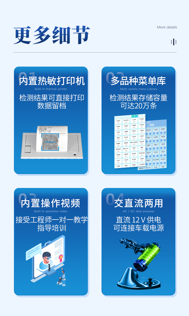| 儀器采用手提一體化系統(tǒng)檢測(cè)技術(shù),將分光光度模塊、數(shù)字化管理模塊、無(wú)線通訊模塊高度集成于一體,可支持檢測(cè)60種食品安全檢測(cè)項(xiàng)目,同時(shí)預(yù)留升級(jí)檢測(cè)方法。 | 儀器檢測(cè)模塊標(biāo)準(zhǔn)化、智能化,檢測(cè)項(xiàng)目可隨意自由組合。檢測(cè)箱體內(nèi)置多個(gè)標(biāo)準(zhǔn)檢測(cè)單元,檢測(cè)模塊可以調(diào)整配置。 | 顯示屏幕:儀器采用10.1英寸豎向液晶觸摸屏顯,搭配運(yùn)行安卓智能操作系統(tǒng),主控芯片采用ARM Cortex-A7,RK3288/4核處理器,主頻1.88Ghz,操作方便,性能更強(qiáng)。 | 檢測(cè)通道:≥12通道;采用精密旋轉(zhuǎn)比色池設(shè)計(jì),使用同芯片同光源校準(zhǔn)精度,解決不同光源之間的誤差值,更加準(zhǔn)確**。(1-12通道間誤差0.1%,***:**202022821055.2) | 儀器光源:高精度進(jìn)口四波長(zhǎng)冷光源,每個(gè)通道均配置 410、520、590、630nm 波長(zhǎng)光源,標(biāo)配**的光路切換裝置,專利光路切換功能可實(shí)現(xiàn)64波長(zhǎng),并且所有檢測(cè)項(xiàng)目可實(shí)現(xiàn)所有通道同時(shí)檢測(cè)。 | 設(shè)備可一鍵校準(zhǔn),自動(dòng)保存校準(zhǔn)數(shù)據(jù),自動(dòng)對(duì)比校驗(yàn),得到精準(zhǔn)光源,采用Android SP存儲(chǔ)數(shù)據(jù),光源數(shù)據(jù)永不丟失,方便每一次使用。 | 通訊接口:配備無(wú)線通信模塊、4G(APN)通訊模塊、藍(lán)牙傳輸,同時(shí)具有雙USB接口以及RJ45網(wǎng)線接口,可以多方式實(shí)現(xiàn)數(shù)據(jù)保存及數(shù)據(jù)傳輸。 | 存儲(chǔ)方式:支持U盤存儲(chǔ),標(biāo)準(zhǔn)USB接口,免驅(qū)動(dòng)安裝。檢測(cè)結(jié)果存儲(chǔ)容量20萬(wàn)條以上,可生成Excel表格進(jìn)行拷貝,并具有登錄保護(hù)功能。 | 智能化操作系統(tǒng): | 1、操作系統(tǒng):儀器可在同一檢測(cè)界面自動(dòng)對(duì)應(yīng)相關(guān)檢測(cè)通道,一次性選擇1-12個(gè)樣品名稱,無(wú)需退出界面,節(jié)省操作時(shí)間。并可以對(duì)每個(gè)通道屬性和樣品信息單獨(dú)進(jìn)行編輯,例如送檢單位、人員,檢測(cè)人員等,打印時(shí)勾選打印顯示。 | 2、數(shù)據(jù)集成系統(tǒng):設(shè)備首頁(yè)自動(dòng)匯總分析檢測(cè)數(shù)據(jù),包含:周檢測(cè)數(shù)據(jù)、月檢測(cè)數(shù)據(jù),全部檢測(cè)總數(shù)量,均包含檢測(cè)總數(shù),合格數(shù),不合格數(shù),以及相關(guān)柱形分析圖,各項(xiàng)檢測(cè)數(shù)據(jù)一目了然,無(wú)需電腦查詢,更加快捷直觀。 | 3、數(shù)據(jù)庫(kù)系統(tǒng):十幾項(xiàng)數(shù)據(jù)庫(kù)分類管理儀器:包含項(xiàng)目類型、項(xiàng)目數(shù)據(jù)、檢測(cè)數(shù)據(jù)、歷史記錄、國(guó)標(biāo)信息、曲線信息、采樣信息、檢測(cè)信息、受檢信息、復(fù)核信息、圖表信息、光源校準(zhǔn)信息、打印樣式信息、樣品庫(kù)信息等等,數(shù)據(jù)庫(kù)之間互相協(xié)調(diào)聯(lián)動(dòng)保證數(shù)據(jù)的真實(shí)完整性。同時(shí)產(chǎn)品數(shù)據(jù)庫(kù)以及歷史檢測(cè)記錄支持一鍵檢索功能。 | 4、限量規(guī)判系統(tǒng):具有限量查詢、添加物質(zhì)合規(guī)判定系統(tǒng)。檢測(cè)出結(jié)果后,系統(tǒng)自動(dòng)調(diào)用系統(tǒng)數(shù)據(jù)庫(kù)中相關(guān)國(guó)標(biāo)進(jìn)行比對(duì)判定,客觀顯示判定結(jié)果是否合格。 | 5、項(xiàng)目預(yù)設(shè)系統(tǒng):儀器具有任務(wù)預(yù)設(shè)模塊,一鍵提前預(yù)設(shè),給出方便快捷的新檢測(cè)方案,每一個(gè)任務(wù)分別可以設(shè)置不同的樣品、批次、編號(hào)、來源、備注、抽樣信息、檢測(cè)信息、受檢信息、復(fù)核信息等更多信息。樣品送檢時(shí)一鍵調(diào)取保存信息,并可多次調(diào)取,大大提高檢測(cè)效率。 | 6、數(shù)據(jù)監(jiān)管系統(tǒng):同步對(duì)接監(jiān)管平臺(tái),數(shù)據(jù)可局域網(wǎng)和互聯(lián)網(wǎng)數(shù)據(jù)上傳,檢測(cè)結(jié)果可選擇直接傳至食品安全監(jiān)管平臺(tái)。進(jìn)行區(qū)域食品安全監(jiān)管及大數(shù)據(jù)分析處理與數(shù)據(jù)統(tǒng)計(jì),檢測(cè)區(qū)域食品安全長(zhǎng)短期動(dòng)態(tài),達(dá)到食品安全問題預(yù)估、預(yù)警。 | 7.1、全新打印系統(tǒng):內(nèi)置全新打印機(jī),新創(chuàng)自定義打印方式,可按需靈活勾選控制:二維碼,抽樣信息、檢測(cè)信息,受檢信息、復(fù)核信息、抽樣日期、檢測(cè)日期等信息的打印。 | 7.2、A4紙版本報(bào)告打印功能(可選配):設(shè)備擁有兩種結(jié)果展示方式,可以自動(dòng)生成A4打印模板和小票打印模板兩種樣式,可通過WiFi及網(wǎng)線等方式鏈接外置打印機(jī)可進(jìn)行打印。 | 供電模式:儀器交直流兩用,直流12V供電,可連接車載電源,可配6ah大容量充電鋰電池,電量可實(shí)時(shí)顯示,方便戶外流動(dòng)測(cè)試。 | 儀器具備遠(yuǎn)程升級(jí)功能,可定向分客戶分儀器更新,開機(jī)后自動(dòng)更新,并可持續(xù)性免費(fèi)更新系統(tǒng)版本,無(wú)需像傳統(tǒng)產(chǎn)品返廠更新,節(jié)省時(shí)間及人力成本并避免了物流運(yùn)輸返廠升級(jí)導(dǎo)致設(shè)備損壞的潛在風(fēng)險(xiǎn)。 |